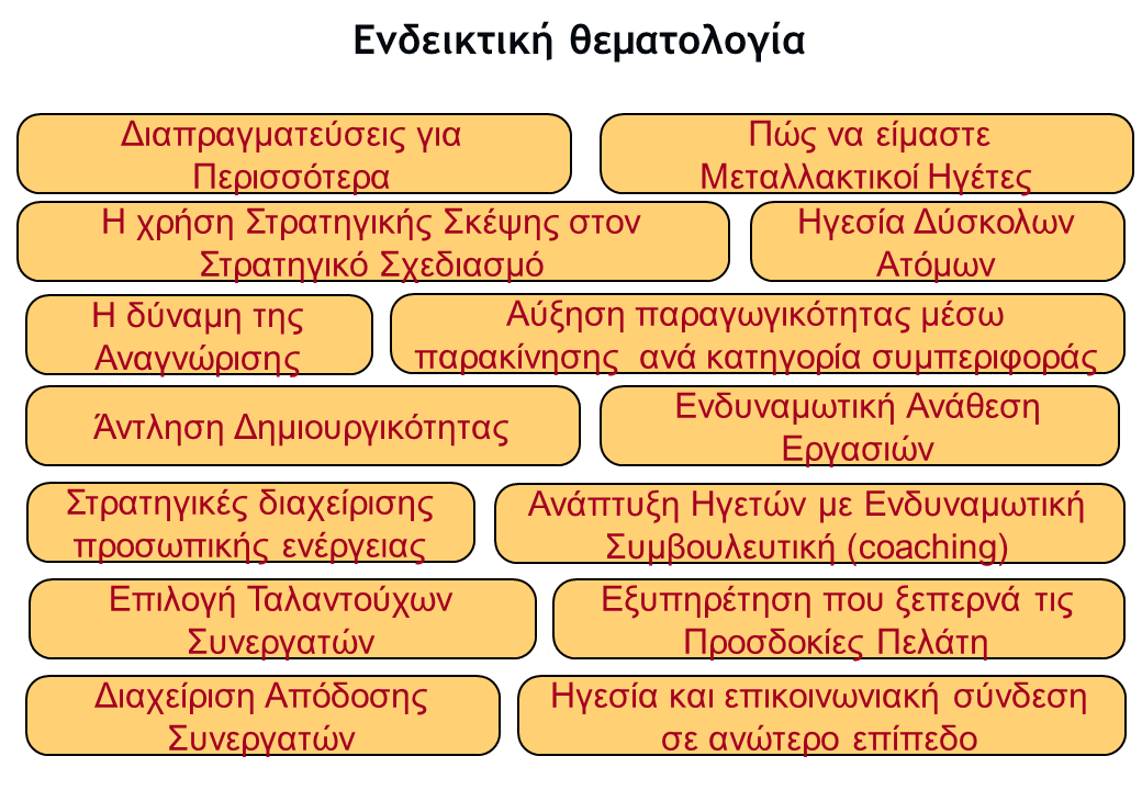δες τη θεματολογίαΗ Μεταλλακτική Ηγεσία είναι ένα εξαιρετικά αποτελεσματικό σύστημα οπτικής και συμπεριφοράς. Σπάνιο διεθνώς και ταυτόχρονα γνώριμο και σε πλήρη σύμπλευση με την ελληνική νοοτροπία. Έρευνες στις ΗΠΑ το καταδεικνύουν ως κρίσιμο και καταλυτικό παράγοντα ανάπτυξης, κερδοφορίας και επιτυχίας κάθε προσπάθειας σε επιχειρήσεις και εργασιακό χώρο.